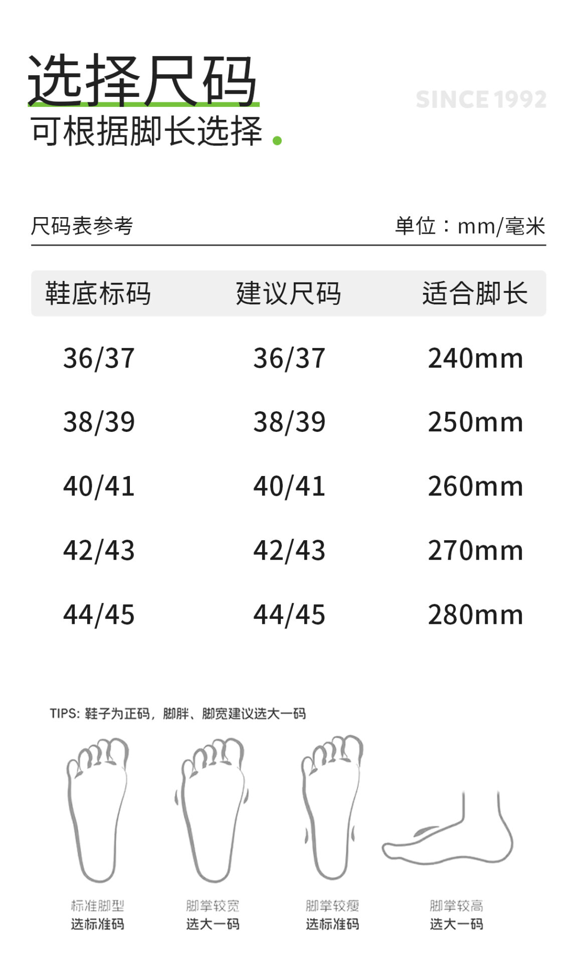 36/37(240), 38/39(250), 40/41(260), 42/43(270), 44/45(280)