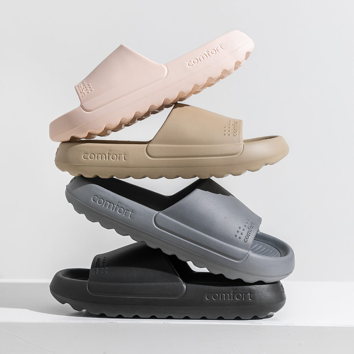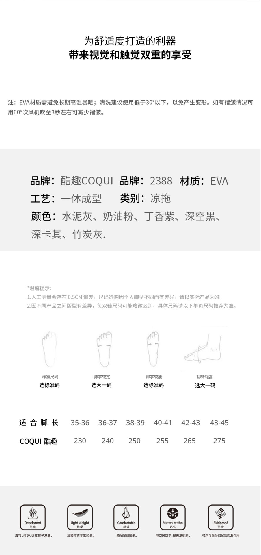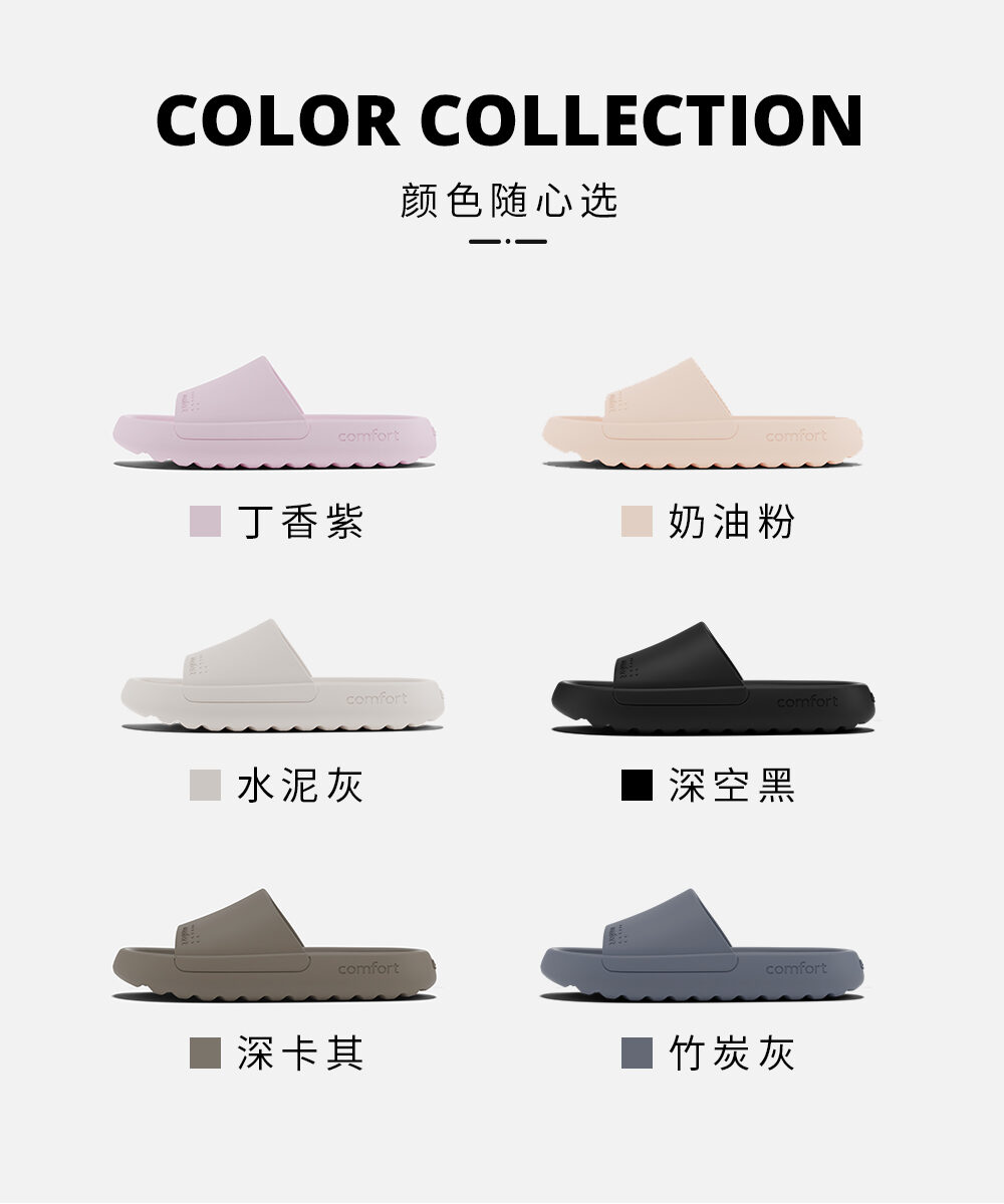 丁香紫, 奶油粉, 水泥灰, 深卡其, 碳灰, 黑色
