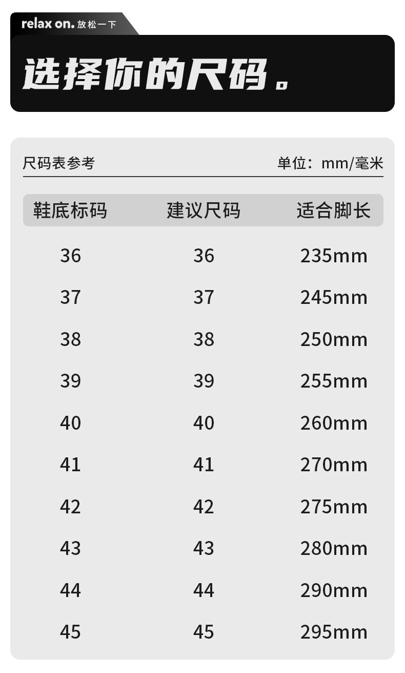 36(235), 37(245), 38(250), 39(255), 40(260), 41(270), 42(275), 43(280), 44(290), 45(295)