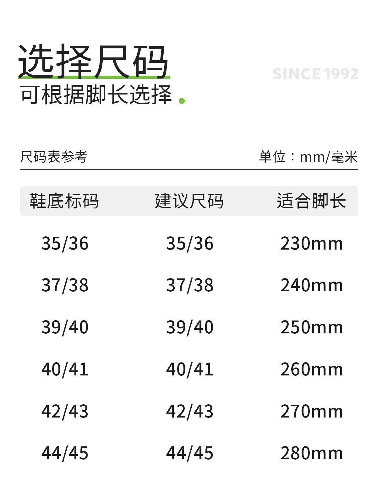 35/36(235), 37/38 (245), 39/40 (255), 40/41(265), 42/43(275), 44/45(285)