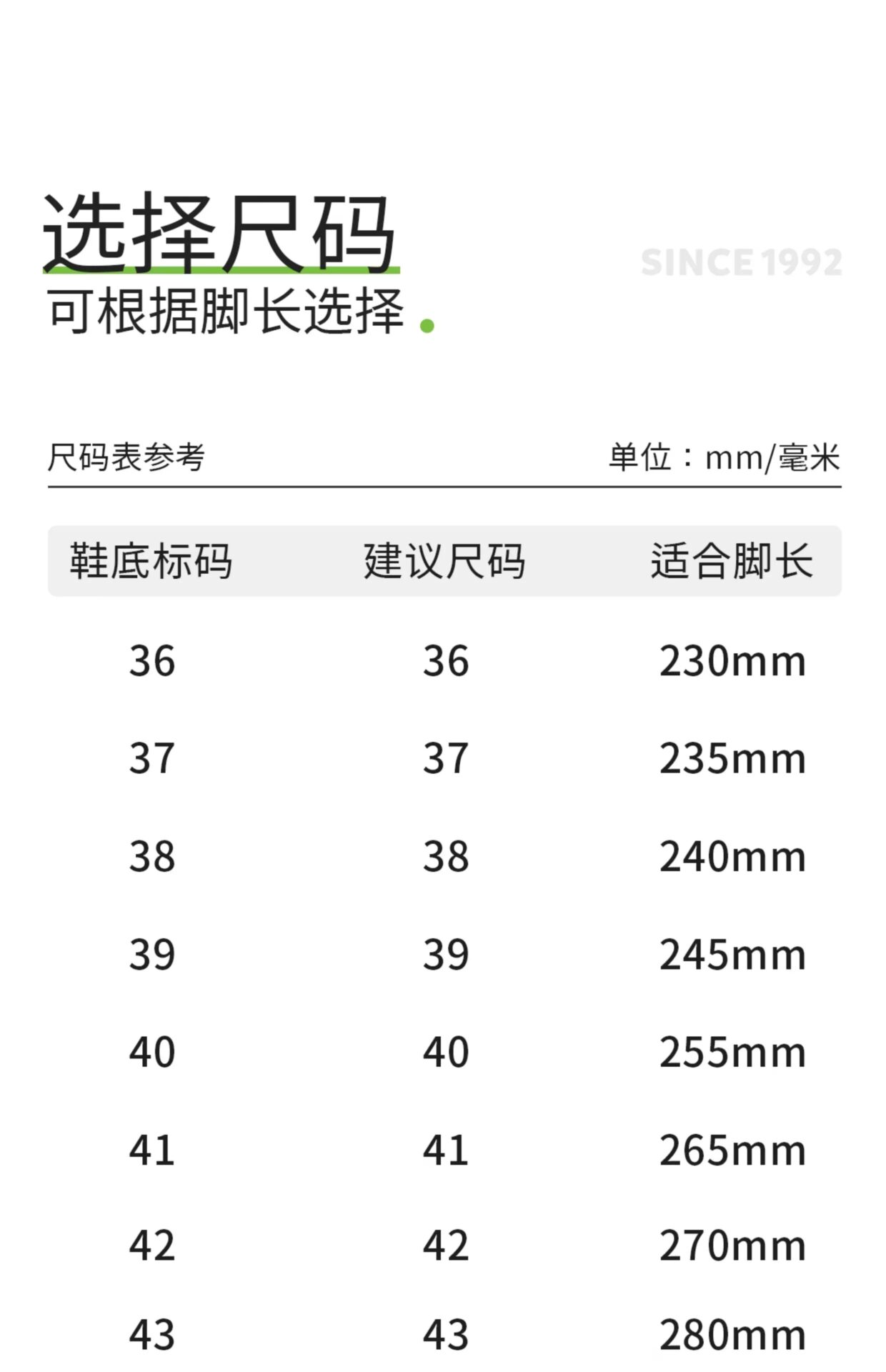 36(230), 37(235), 38(240), 39(245), 40(255), 41(265), 42(270), 43(280), 44(290)