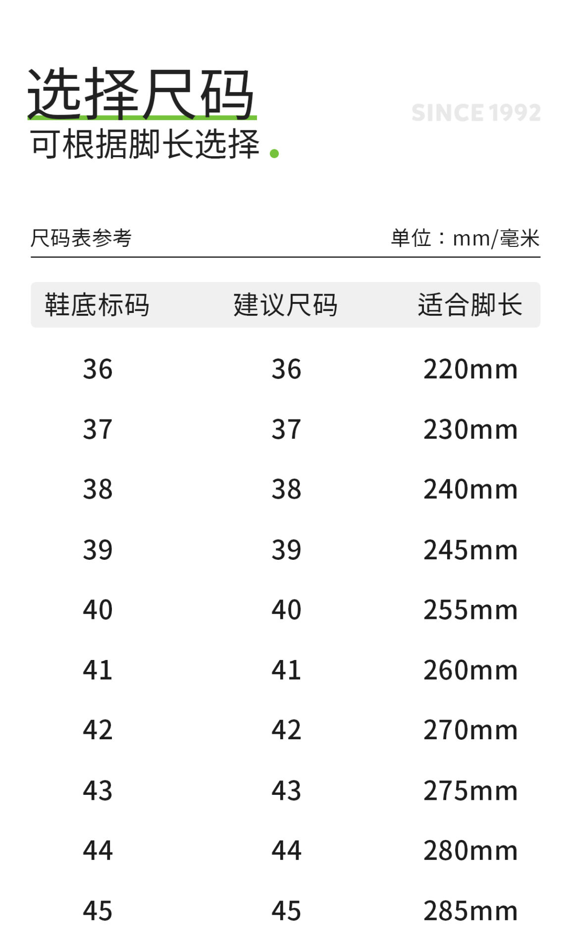 36(220), 37(230), 38(240), 39(245), 40(255), 41(260), 42(270), 43(275), 44(280), 45(285)