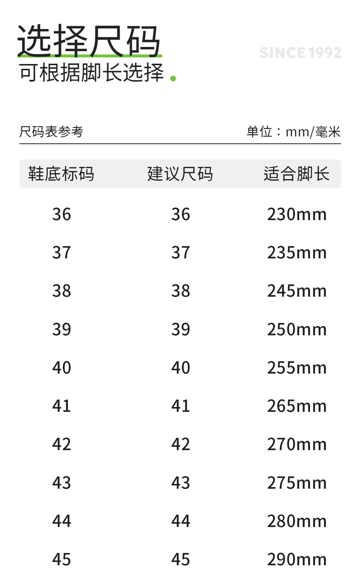 35/36(235), 37/38 (245), 39/40 (255), 40/41(265), 42/43(275), 44/45(285)